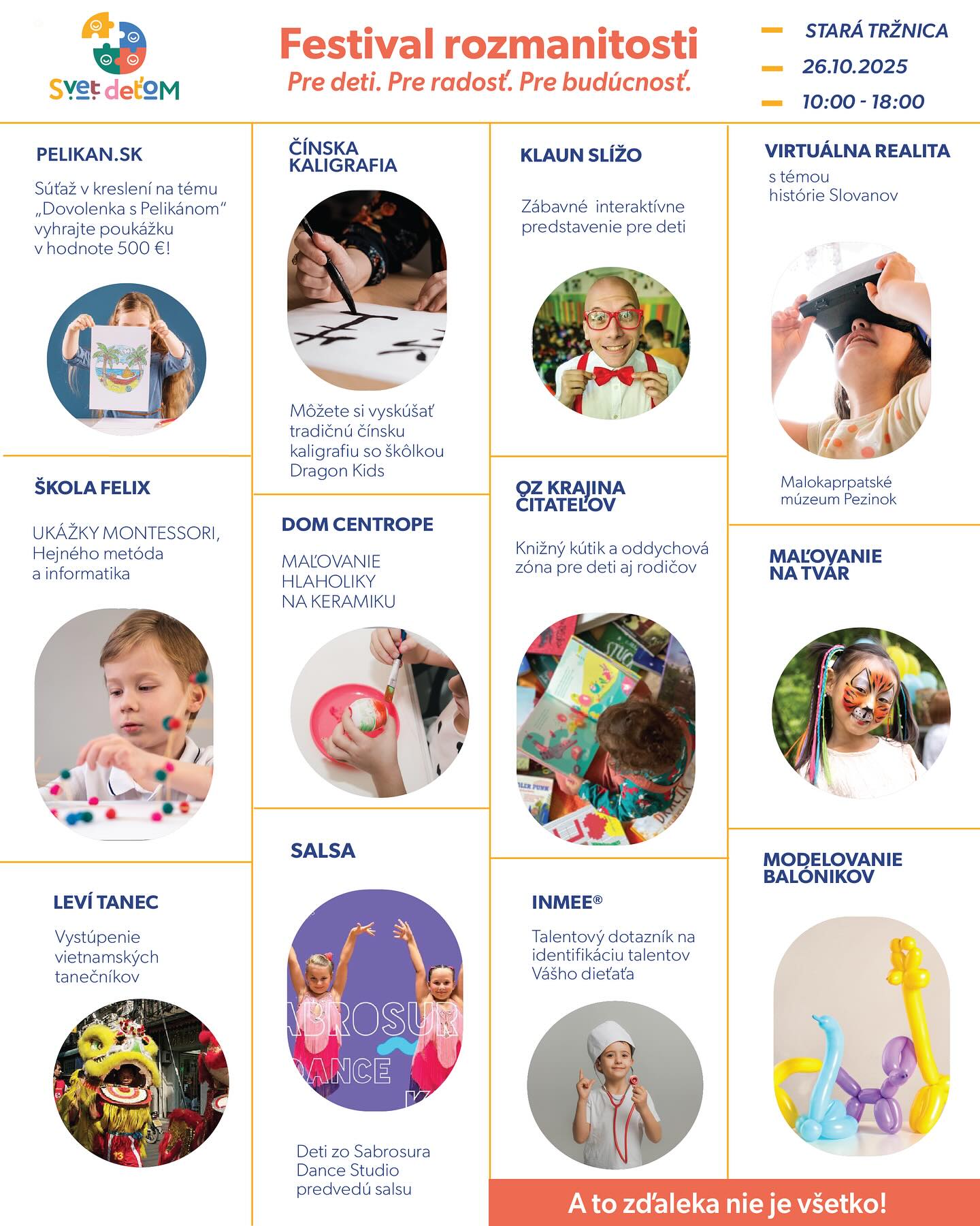 V spolupráci so Starou tržnicou pripravujeme 26. októbra 2025 v Bratislave prvý ročník festivalu Svet deťom. Program sa bude konať medzi 10:00 – 18:00.