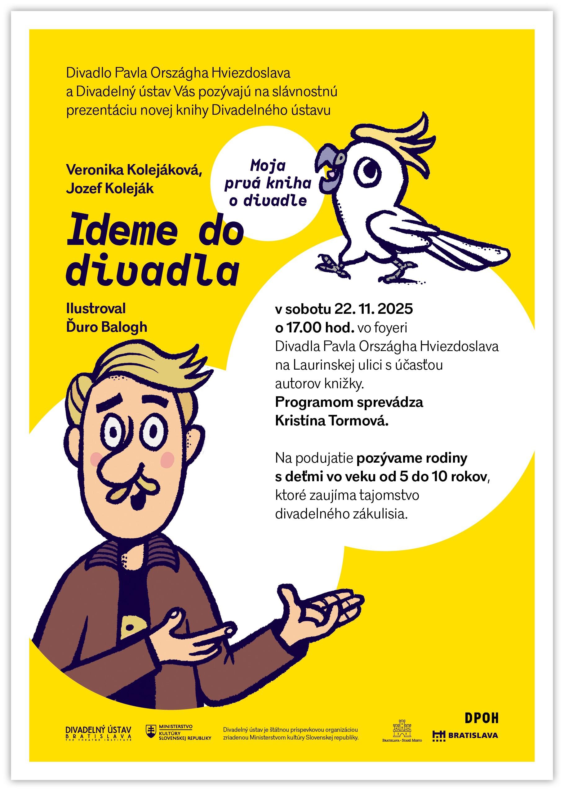Divadlo Pavla Országha Hviezdoslava a Divadelný ústav Vás pozývajú na slávnostnú prezentáciu novej knihy Divadelného ústavu Veronika Kolejáková, Jozef Koleják: "Ideme do divadla. Moja prvá kniha o divadle" vo foyeri DPOH s účasťou autorov knižky.